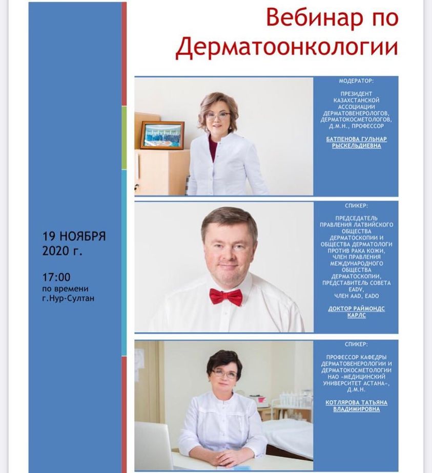 We are pleased to inform you that on November 19, at 17:00 Nur-Sultan time, the continuation of the summer series of webinars on dermato-oncology will take place. You can expand your knowledge about actinic keratosis and squamous cell carcinoma of the skin. In addition, interesting cases and an interactive section are waiting for you.
