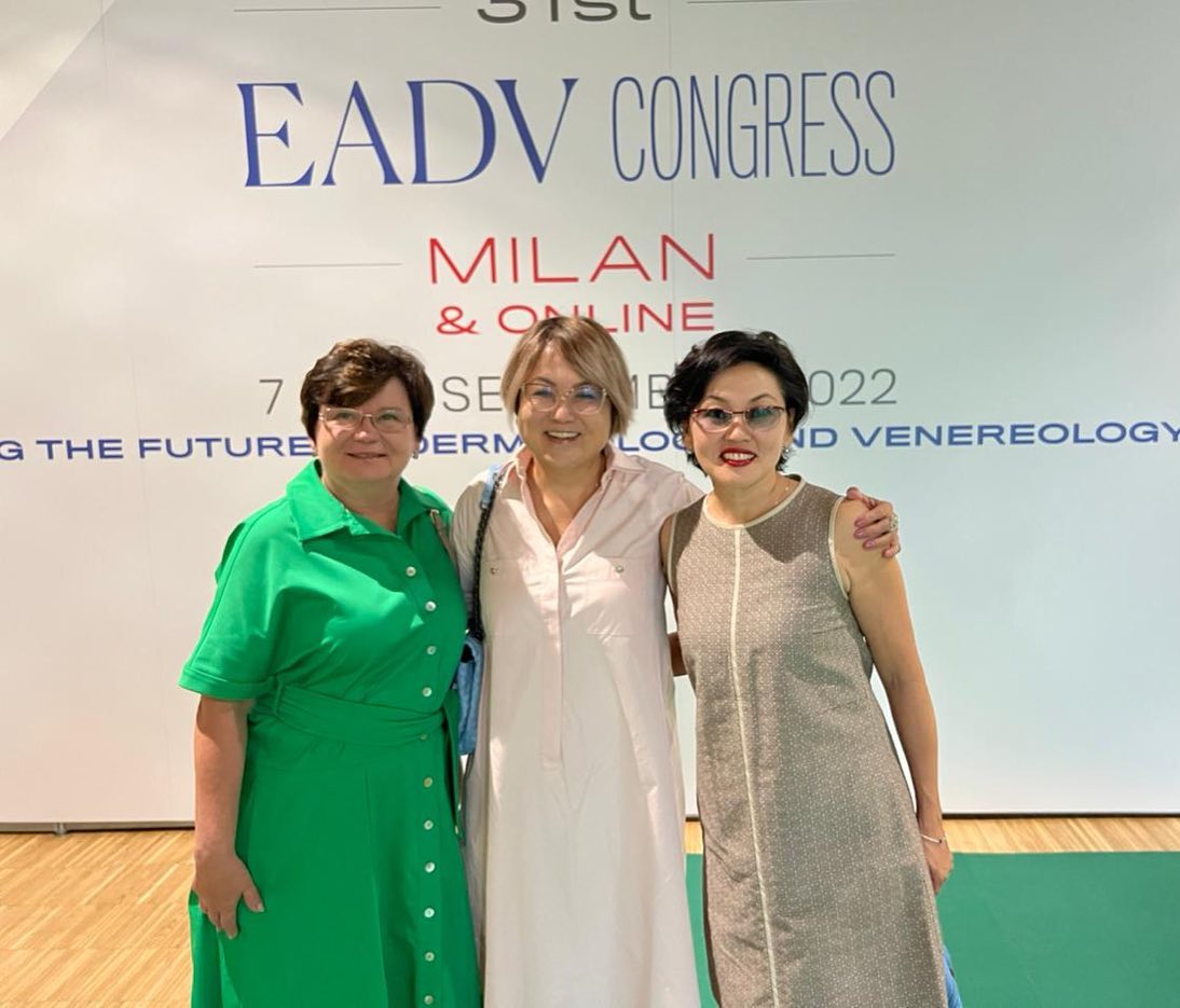 Казахстанская делегация в лице Президента КАДД, профессора Батпеновой Г.Р., членов ассоциации проф.Котляровой Т.В. и ассоциированного профессора Джетписбаевой З.С.на 31-ом международном Конгрессе Европейской Ассоциации дерматологии и венерологии (7-10 сентября 2022г.).